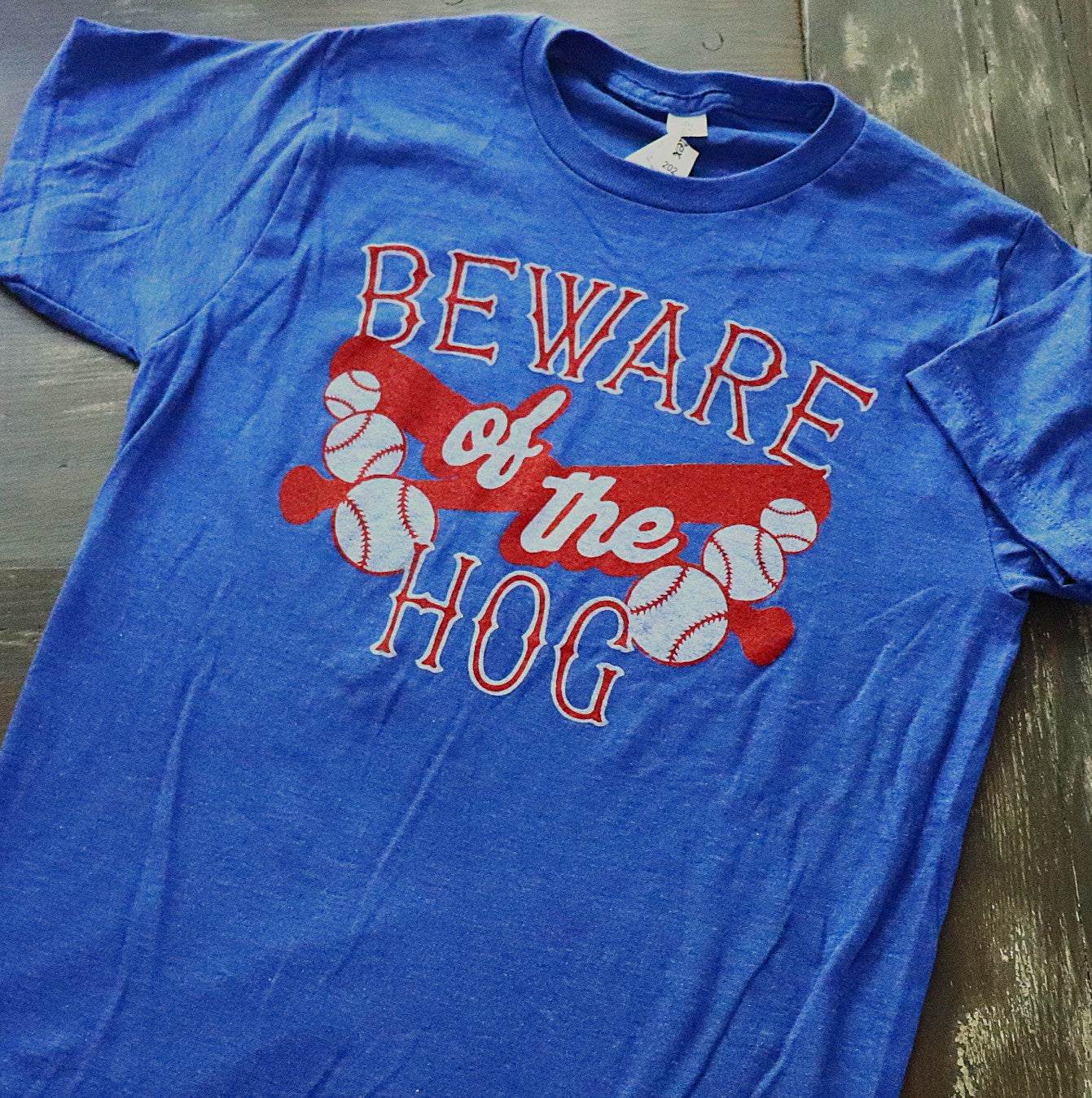 Make a bold statement with this unisex short sleeve tee featuring "Beware of the Hog" in a classic red font across the front. Accented with baseballs and bats, this heather royal soft-style shirt combines comfort and sporty design for fans ready to show their competitive edge.