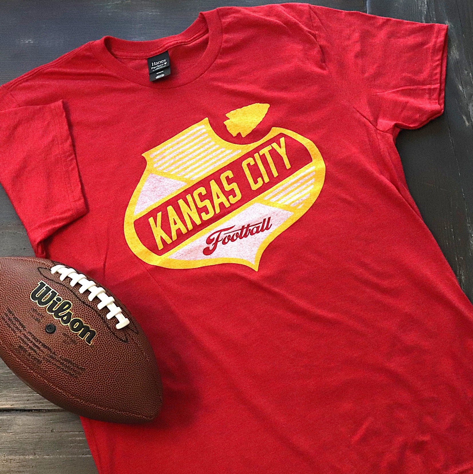 This soft heather red tee features a striking graphic reminiscent of the city's classic, historic breweries. The design is printed in a bold gold and white, featuring "Kansas City" scripted proudly across the chest and anchored by a classic arrowhead icon.